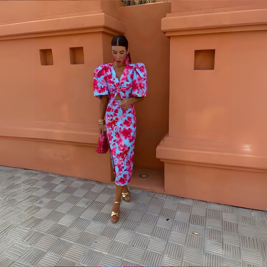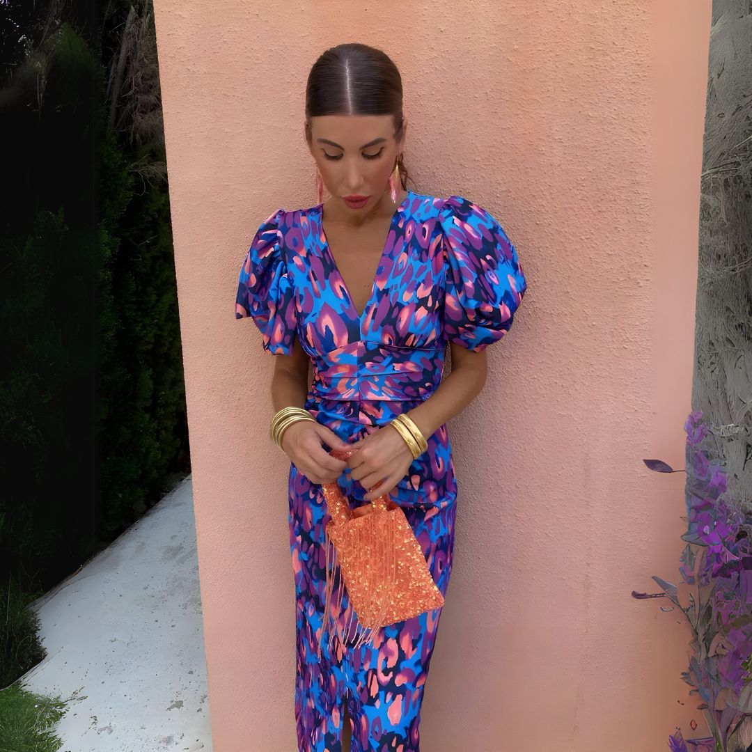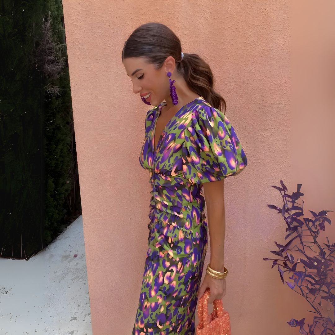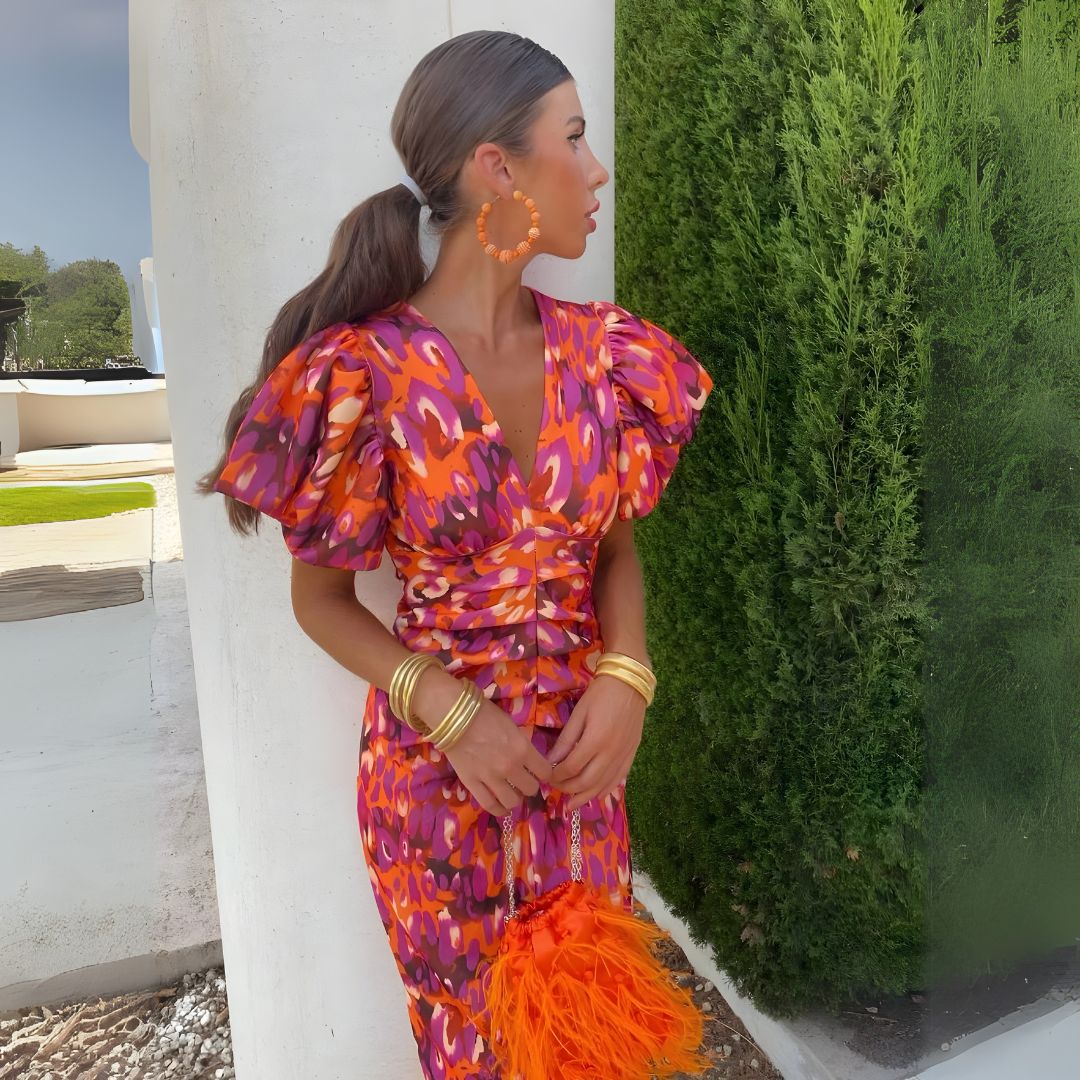 🔹 Typ: Midi sukienka z kolorowym nadrukiem i bufkami